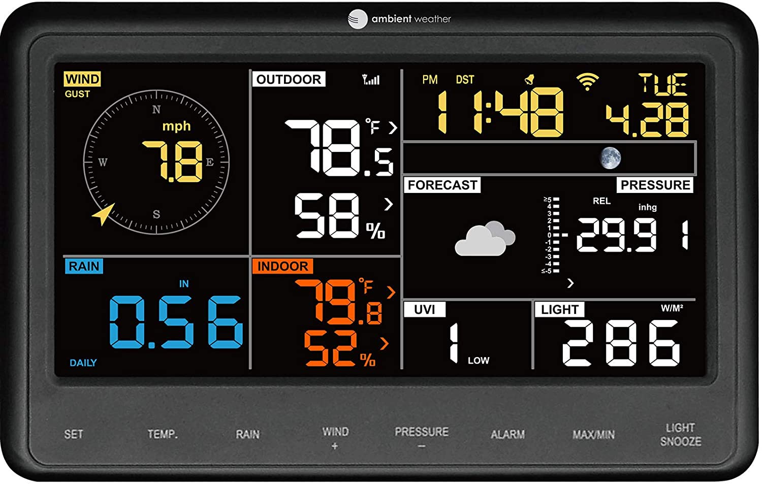 Monitor indoor and outdoor conditions, including wind speed, wind direction, rainfall, UV, solar radiation, indoor temperature, indoor humidity, barometric pressure, dew point, heat index, wind chill and more.